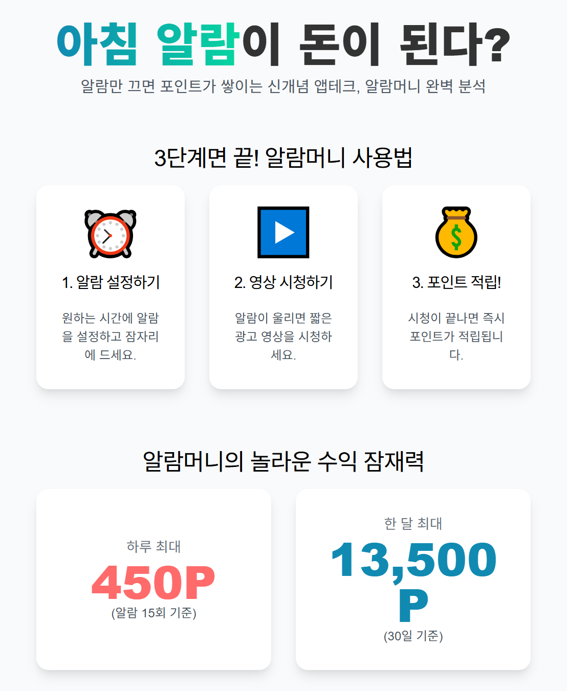 • 다른 앱테크와의 비교: 만보기 앱이 하루 만 보를 힘들게 걸어도 100포인트 남짓을 주는 것에 비하면, 알람머니는 단순히 알람을 듣는 것만으로 그 몇 배를 벌 수 있는 거죠. 힘든 신체 활동 없이도 수익을 얻을 수 있다는 것이 큰 장점입니다.