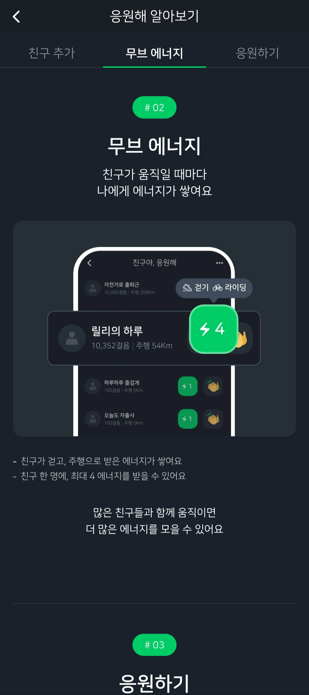 - 걷기: 50걸음을 걸을 때마다 1에너지를 얻을 수 있습니다. 하루 최대 100에너지까지 적립 가능합니다.