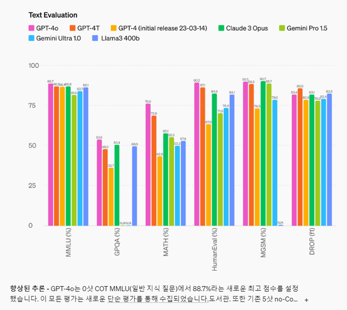 - GPT-4o 의 API도 출시되어 두 배 더 빠르고 50% 가격 할인된 서비스를 이용할 수 있다.